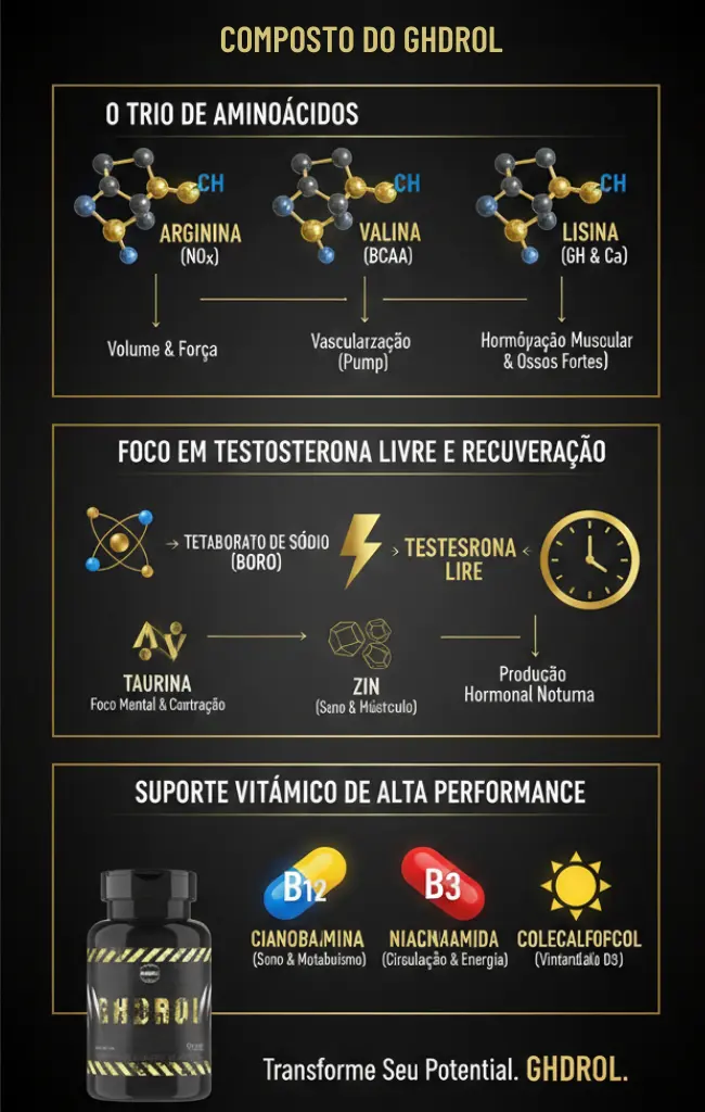 Muitos acreditam que para ter um corpo de respeito é necessário viver em um regime de privação extrema ou recorrer a substâncias perigosas. O GHDROL quebra esse paradigma. Ele serve como um modulador de performance, focado em três pilares que decidem se você terá resultados ou se continuará sendo apenas o “cara que treina”.
