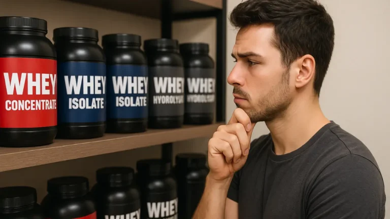 Guia sobre os tipos de whey protein, mostrando o que muda entre concentrado, isolado e hidrolisado.