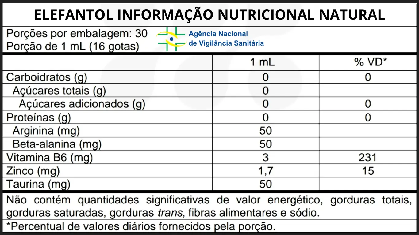 O Elefantol é um suplemento alimentar líquido, isento de registro conforme as RDCs vigentes para essa categoria, e não contém glúten. A recomendação é sempre respeitar a dosagem indicada e manter o uso diário para melhor aproveitamento da fórmula.