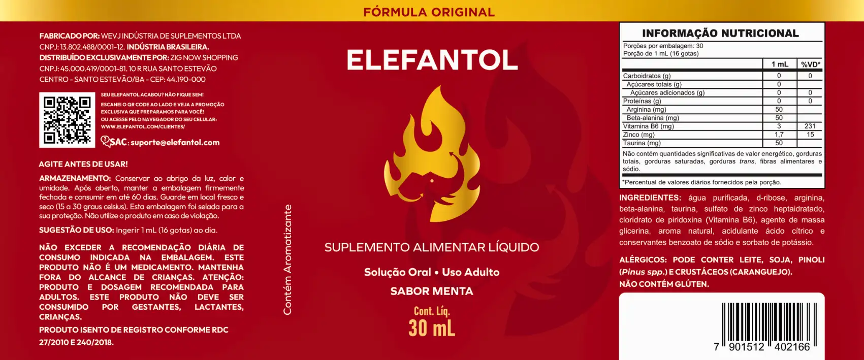 O Elefantol é um suplemento alimentar real, com fabricante identificado, rótulo completo, composição declarada e canais oficiais de contato com o consumidor. Não se trata de um produto genérico ou sem procedência.